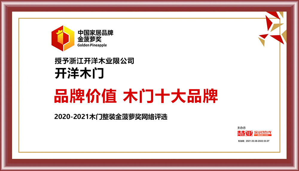 開(kāi)洋榮獲慧亞家居網(wǎng)評(píng)選頒發(fā)的木門十大影響力品牌開(kāi)洋全面升級(jí)導(dǎo)入酷家樂(lè)-全屋E柜數(shù)字化系統(tǒng)開(kāi)洋榮獲品牌之家中品榜授予的木門十大品牌稱號(hào)