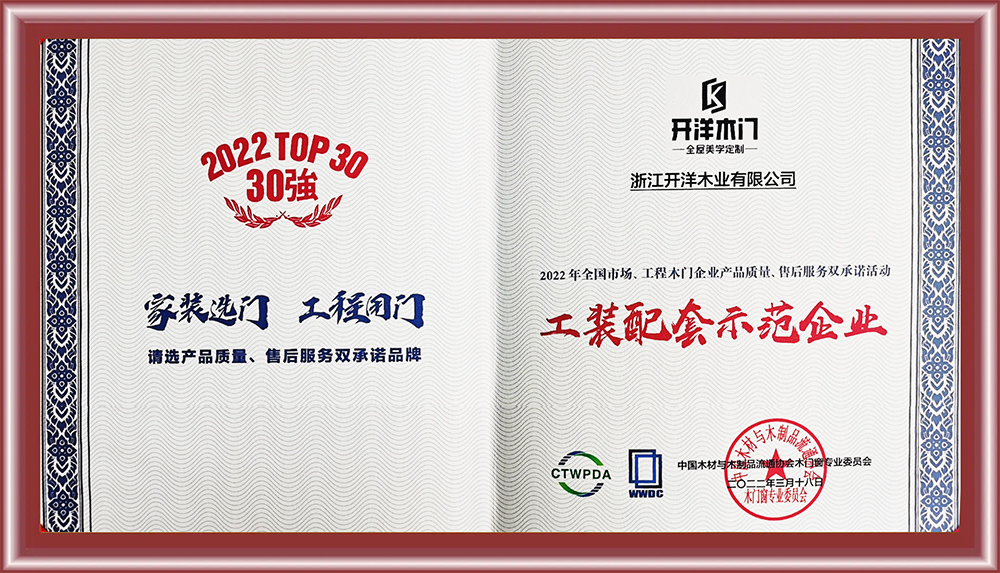 中國(guó)木制品流通協(xié)會(huì)木門窗專委會(huì)授予開(kāi)洋木門TOP 30強(qiáng)稱號(hào)開(kāi)洋產(chǎn)品成功晉入萬(wàn)科、綠地旗下部分項(xiàng)目木制品供應(yīng)商